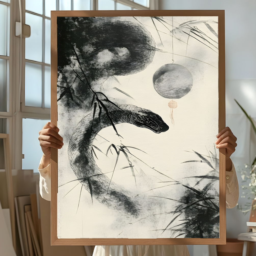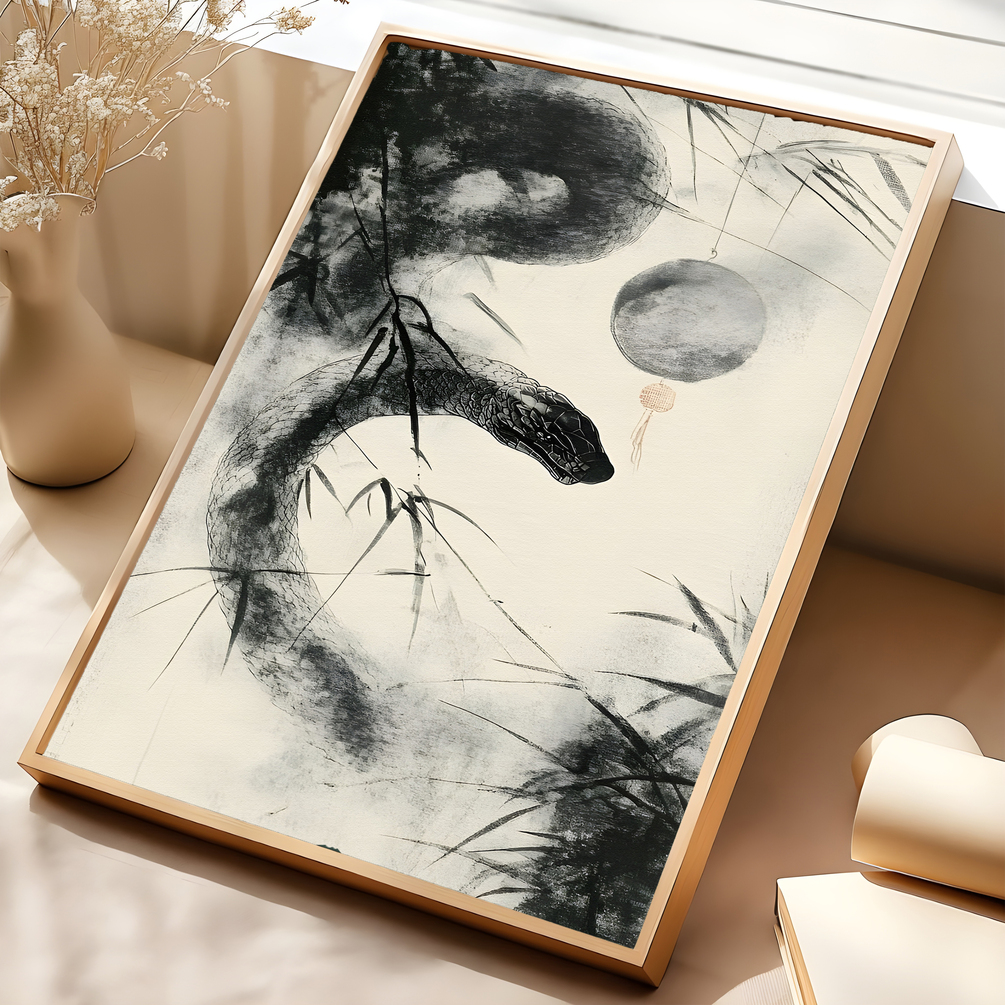 Print it as a poster, canvas, or framed art for your living room, bedroom, or creative studio. The serpent symbolizes power and transformation, while the moon lamp radiates calm and mystery — making this a true Pinterest-worthy statement piece.